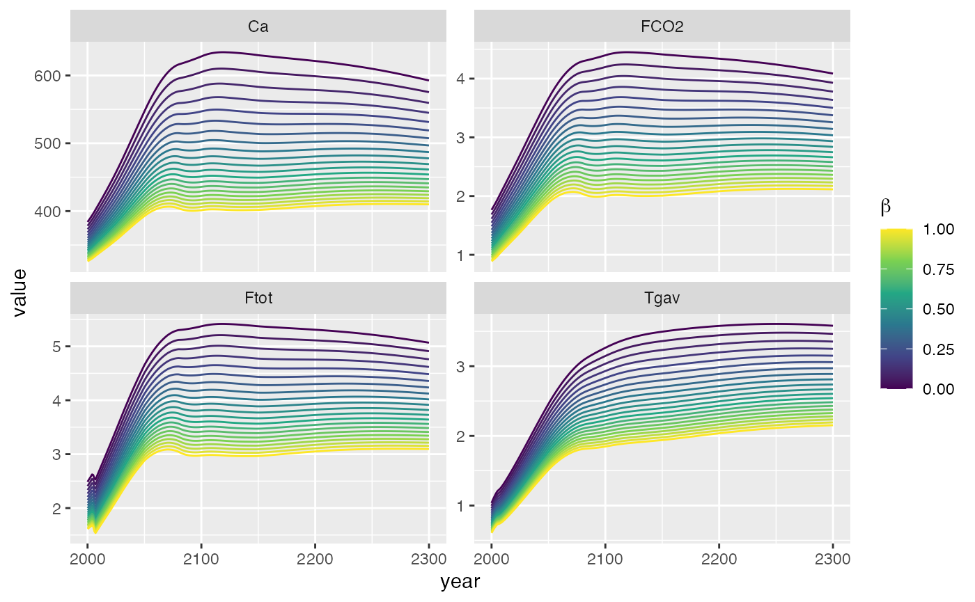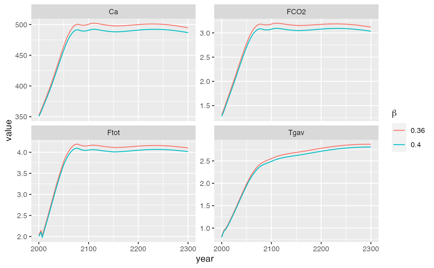 As we can see, the ability of CO\(_2\) fertilization to offset carbon emissions is saturating – at high values of \(\beta\), the same increase in \(\beta\) translates into a smaller decrease in atmospheric CO\(_2\) and related climate effects.
